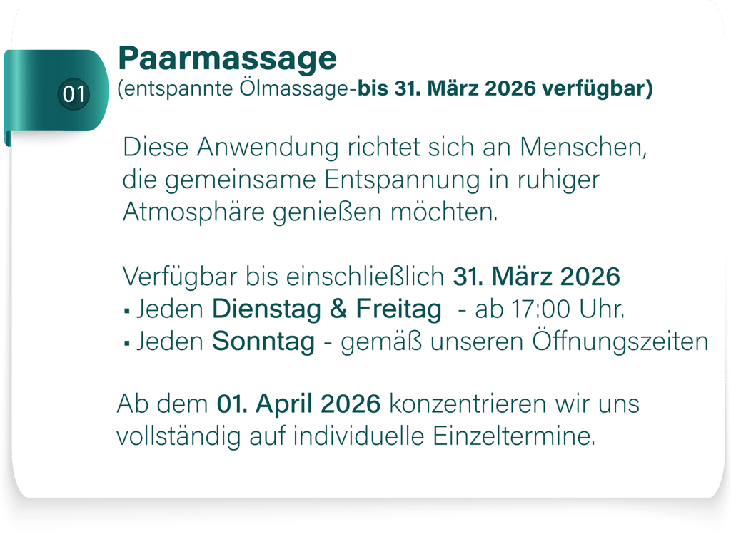Wenn Körper und Geist in Einklang sind, entsteht neue Kraft für Alltag, Beruf und persönliche Entwicklung. Ihr Körper sendet Signale – achtsame Wahrnehmung kann helfen, wieder mehr Balance zu finden. Ob Sie eine entspannende Öl-Massage genießen oder sich in bestimmten Bereichen mehr Entlastung wünschen – bei HEILEN & BALANCE sind Sie herzlich willkommen.